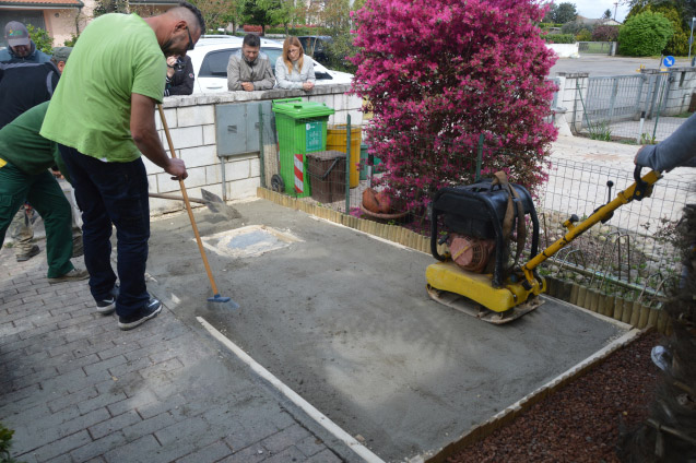 Dopo aver livellato lo stabilizzato compattarlo con un compattatore vibrante a motore, stando attenti a non andare sopra al perimetro di stanghetti in legno.